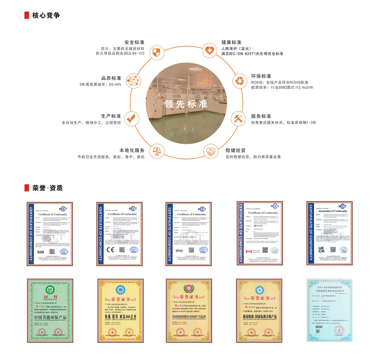 产品已通过ROHS、CE、IP65、UKCA 、ICES-003认证,并获得全国系统集成智能化行业市场用户首选品牌、质量.服务.诚信AAA企业、质量检验.国家标准合格产品、广东省创新创优.质量品牌双承诺单位、中国节能环保产品等证书,项目负责人具备智能化系统集成项目经理(高级),施工维护人员具备中国广东协会颁发的《LED显示应用技术工程师》等等。