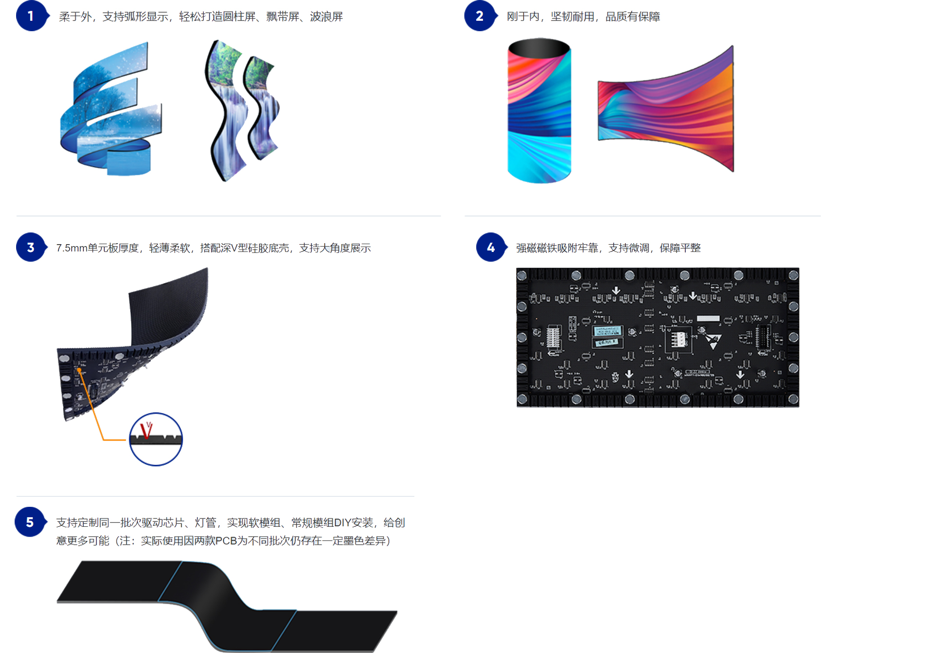 柔性软件软模组拼接:无缝拼接,高清高灰、画面显示清晰细腻,弹性可曲,宽广视角,柔于外,支持弧形显示,轻松打造圆柱屏、飘带屏、波浪屏等,支持定制同一批次驱动芯片、灯管,实现软模组、常规模组DIY安装;