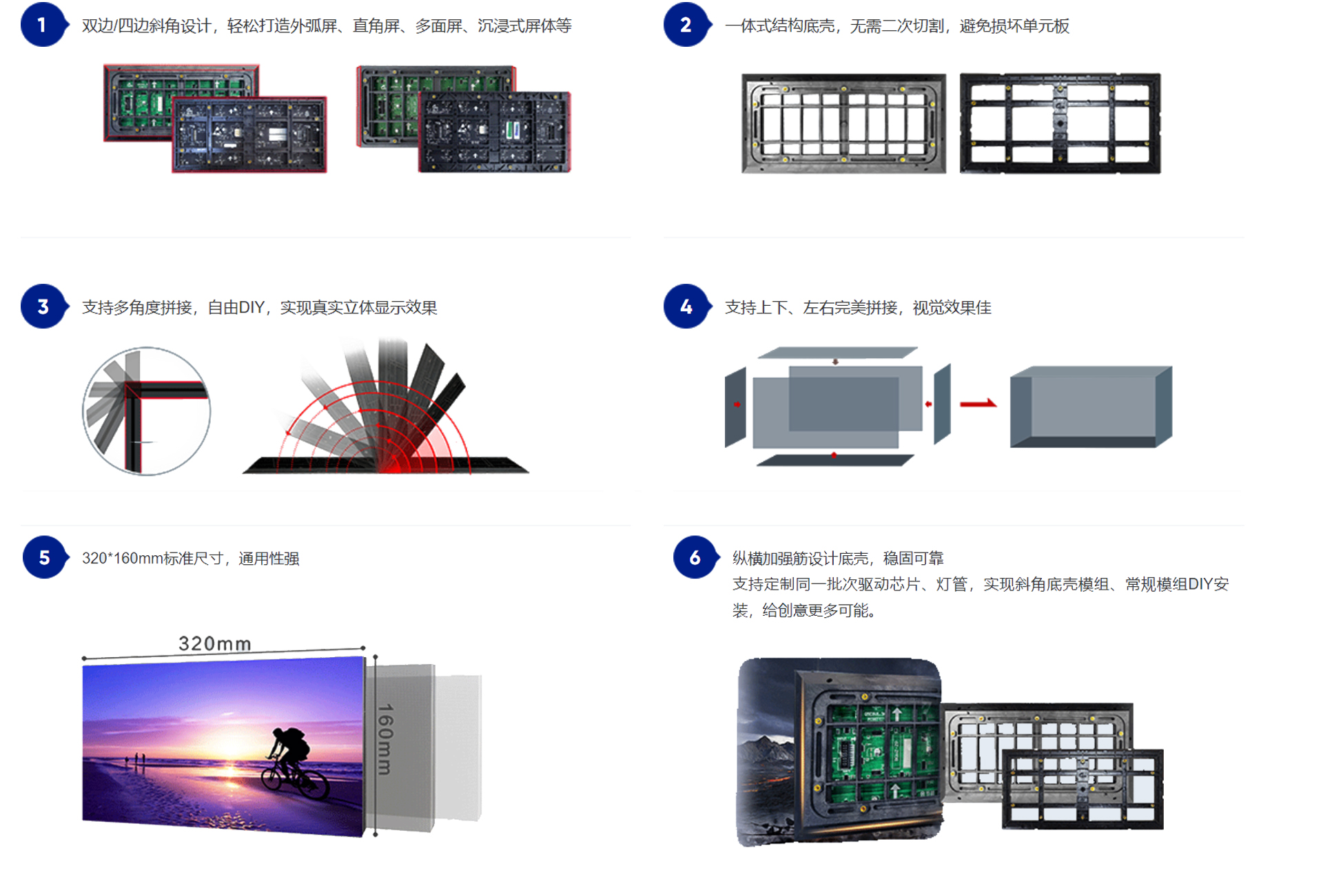 斜角底壳模组拼接:无缝拼接,高清高灰、画面显示清晰细腻,双边/四边斜角设计,轻松打造外弧屏、直角屏、多面屏、沉浸式屏体等,支持多角度拼接,自由DIY,实现真实立体显示效果,支持定制同一批次驱动芯片、灯管,实现斜角底壳模组、常规模组DIY安装;