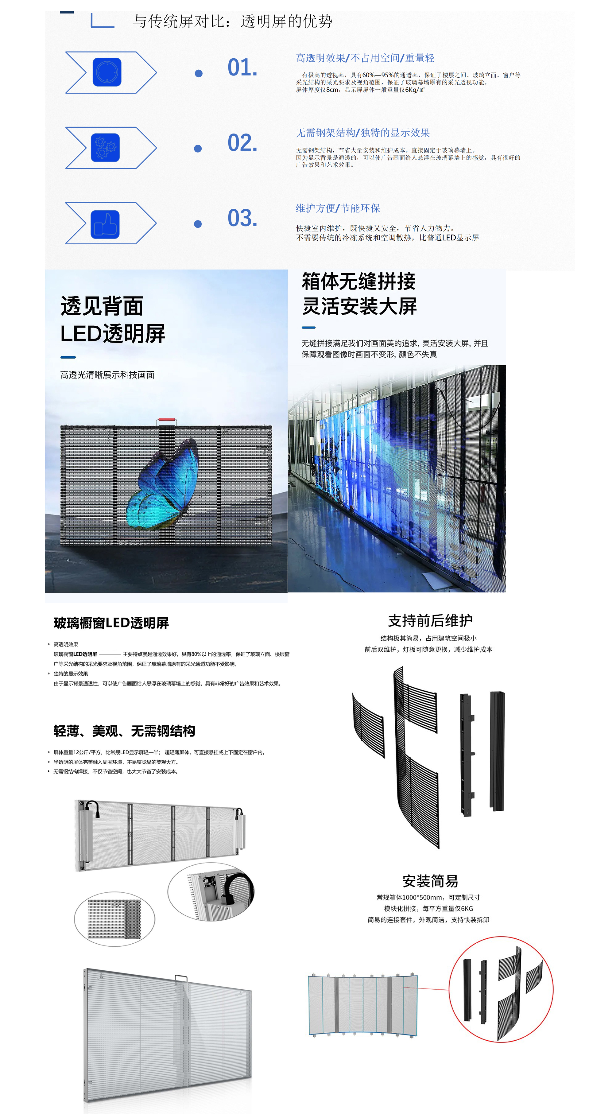 如今,无论是走在马路上,还是走进商场里,我们都可以轻易发现LED显示屏的存在,作为信息传递和气氛装饰的重要媒介,LED屏受到大家的青睐,LED透明屏优点:高透明效果、不占空间、重量轻、无需钢架结构、独特显示效果、维护方式、节能环保;