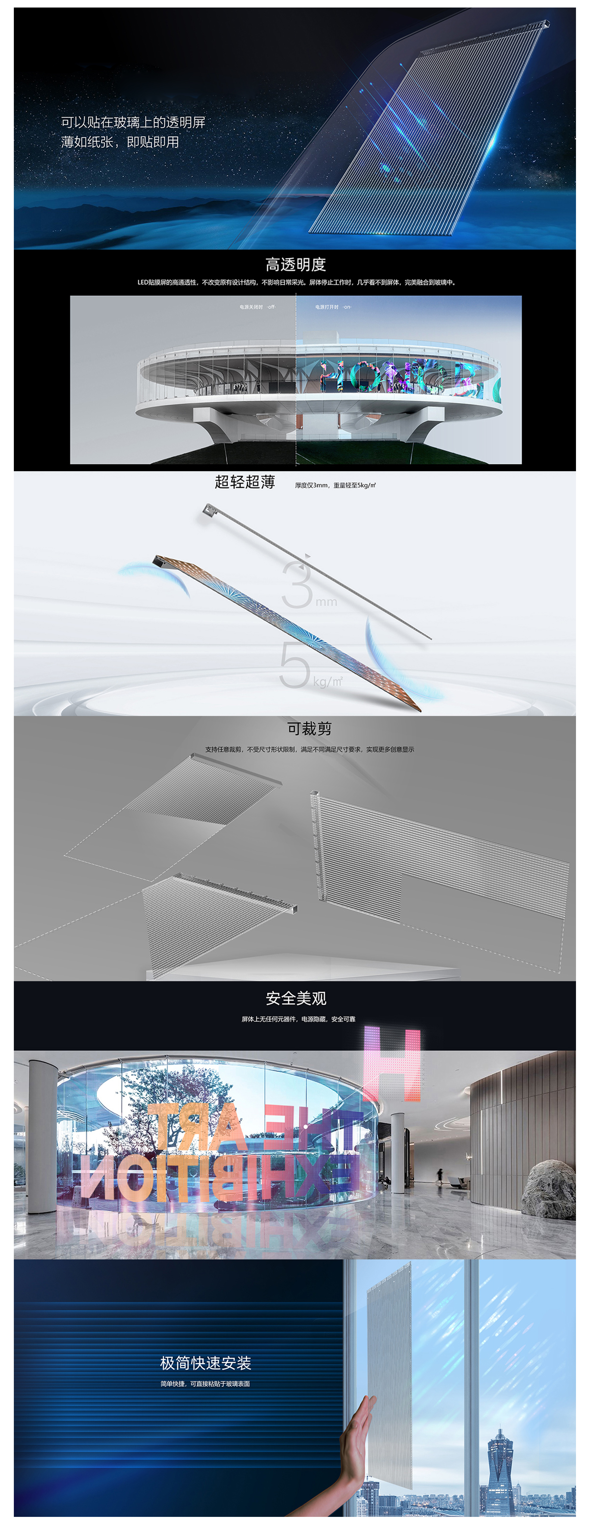 LED贴膜屏是一款可直接粘贴的柔性透明LED显示屏,具有可弯曲,可裁剪,不受尺寸形状限制,适应弧形结构,超轻超薄,高通透等特性。凭借外观近乎隐形节能,安全美观等多项优势,可提升商业环境的科技感,现代感,渲染气氛,吸引人群;打造高科技智能显示播放平台,商业价值巨大。